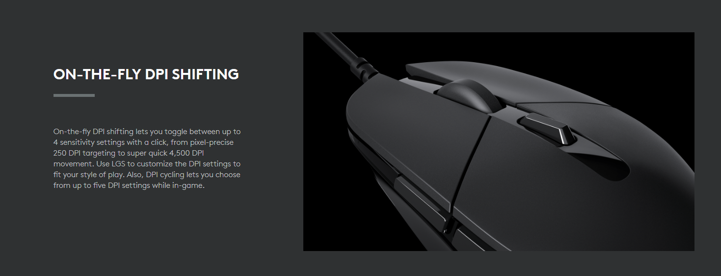 Resolution: 200 – 4,000 dpi Zero smoothing/acceleration/filtering Max. acceleration: >20 g 1Tested on Logitech G240 Gaming Mouse Pad Max. speed: >120 IPS 2Tested on Logitech G240 Gaming Mouse Pad |